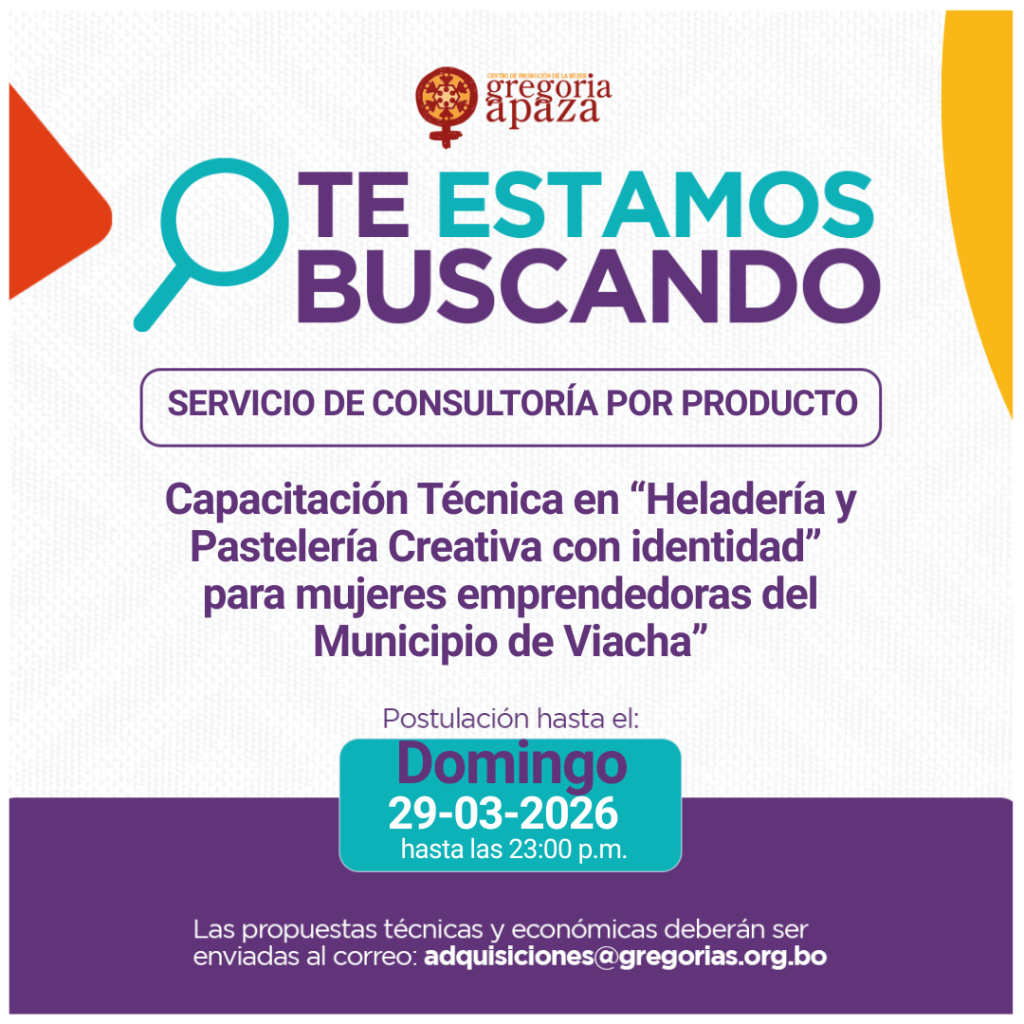 La propuestas deberán enviar hasta el DOMINGO 29 de marzo de 2026 hasta horas 23:00 PM , en forma digital al correo: adquisiciones@gregorias.org.bo propuestas fuera de plazo por favor abstenerse.