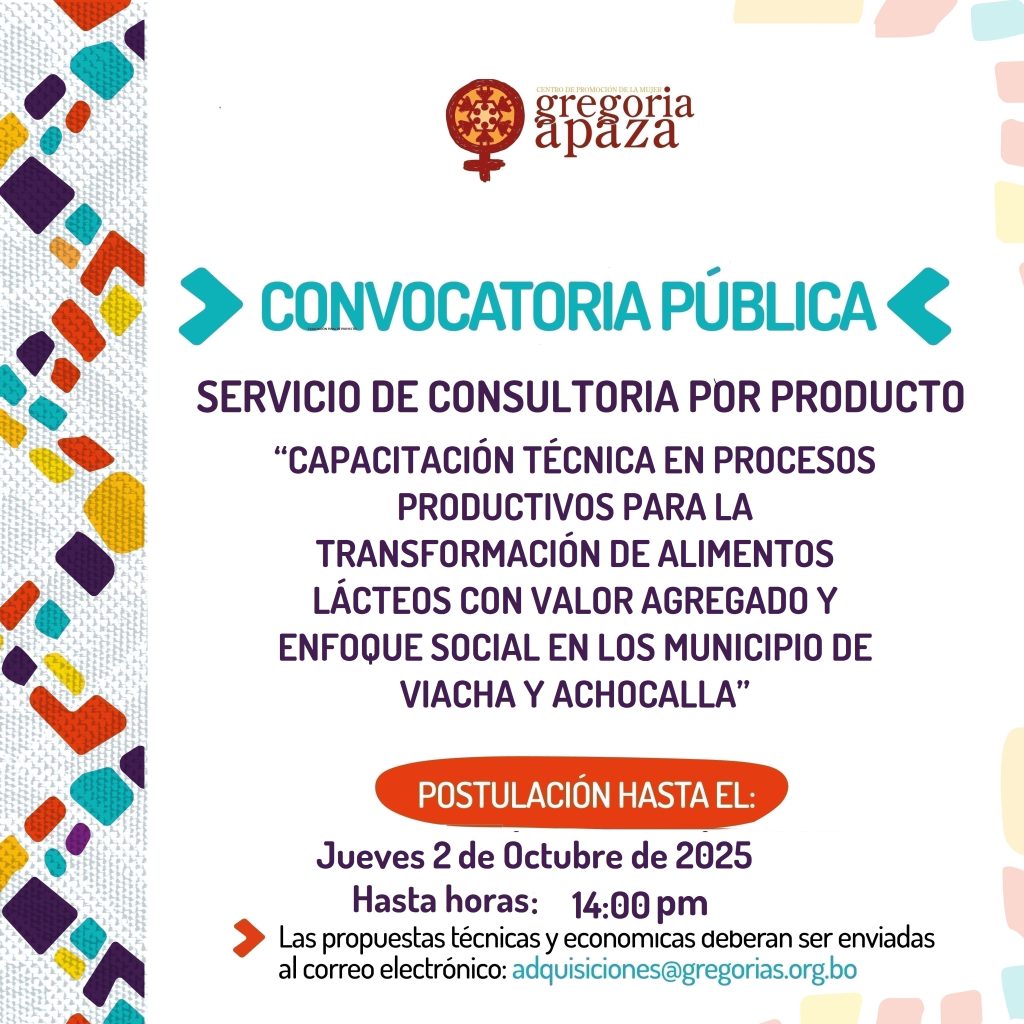 SERVICIO DE CONSULTORÍA PARA “Capacitación Técnica en procesos productivos para la transformación de alimentos lácteos con valor agregado y enfoque social en los Municipio de Viacha y Achocalla”