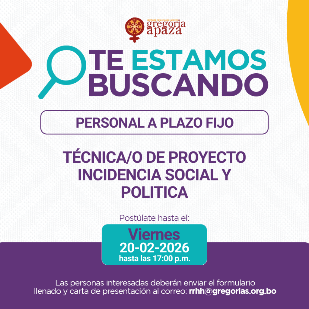 El Centro de Promoción de la Mujer Gregoria Apaza es una organización civil sin fines de lucro que busca el reconocimiento, goce y ejercicio pleno de los derechos humanos de las mujeres y requiere incorporar a su equipo de trabajo personal para el cargo de: